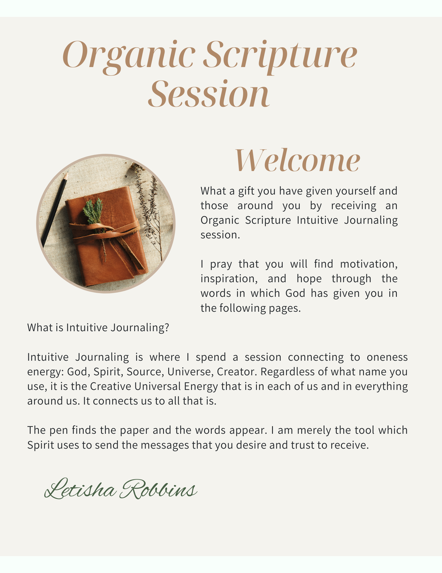 I also love journaling Personal Organic Scripture Sessions. What a blessing for me to be able to share with another the words from God/Spirit. I love hearing from individuals that the words from Spirit have guided, assisted, reassured or even opened the door to new ideas that they had not contemplated. It truly is a gift for yourself, to the take the step towards self-empowerment, self-healing and connection to find peace, freedom and the connection to oneness that is spirit.